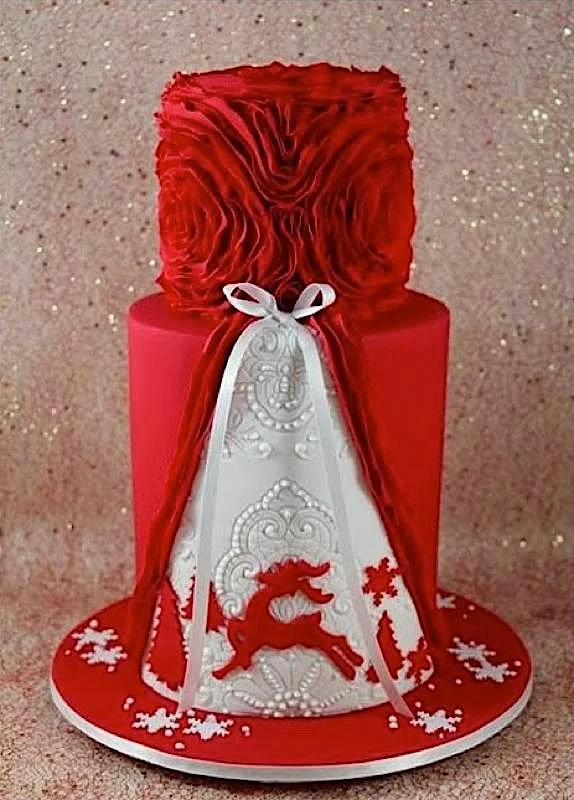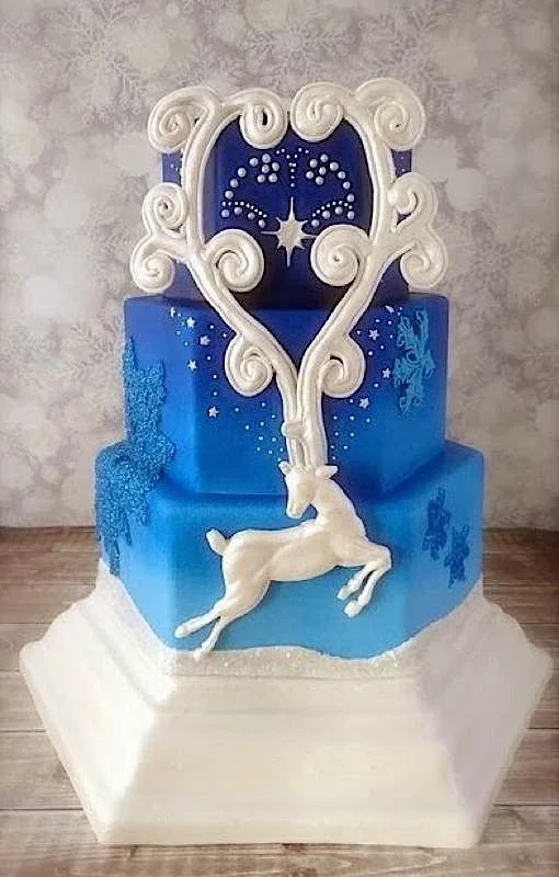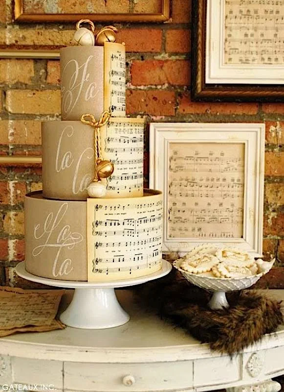 I thought those were stacked hat boxes, but nope; it's cake, and everything on it is edible. The bells, the silky gold robe, and of course the sheet music sides. Plus the solid side has this gorgeous shimmer you can really only see up close: